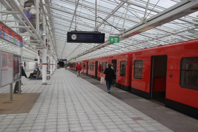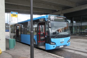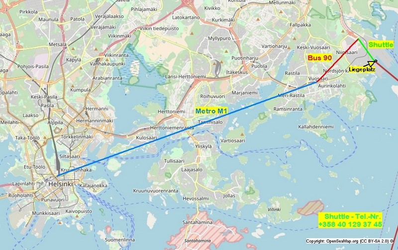 Der Shuttle-Bus (Tel.-Nr. +358 40 129 37 45) bringt uns zum Gate, dort (Station: Hansa-Terminal) können wir direkt vor dem –auch von Finnlines genutzten– Terminal in den Linienbus der Linie 90 steigen (Fahrkarte beim Fahrer), der uns bis zur Metrostation in Vuosaari bringt. Wir könnten jetzt mit der gleichen Fahrkarte mit der Metro weiter nach Helsinki fahren; tun wir aber nicht.