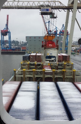 Am Donnerstagmorgen zeigt sich Hamburg tief verschneit. Dank meiner Freunde, die mich netterweise mit dem Pkw zum Terminal gefahren haben, bin ich gut und bequem am Kai gelandet.