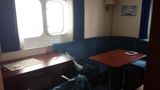 Ein Crewmitglied trägt mein Gepäck die Außentreppe rauf, ein freundlicher blonder Mann öffnet die Tür zum D-Deck und zeigt mir meine Kammer, stellt sich kurz vor "Ich bin Kapitän Drewes", und hat dann natürlich Wichtigeres zu tun. Also erstmal ankommen und einrichten. Zu "wichtiger" zählt immerhin, dass er um 12:00 an meine Tür klopft und mitteilt, dass es jetzt in der Messe Mittagessen gibt.