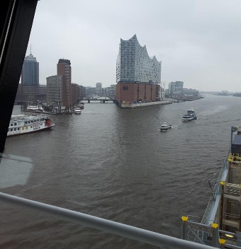 Kurz nach Mittag geht es vom Burchard-Kai CTB quer durch Hamburg zum Südwest-Terminal SWT. Genau gegenüber der Elbphilharmonie: Tolles Panorama!