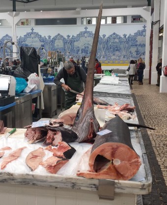 Als erstes habe ich die schöne, große Markthalle entdeckt, das ist natürlich was für mich. Auch hier ist die Stirnwand mit aufwendigen Fliesen geschmückt. Dazu ein tolles Angebot, in erster Linie natürlich Fische, aber auch Fleisch, Geflügel, Obst und Gemüse.