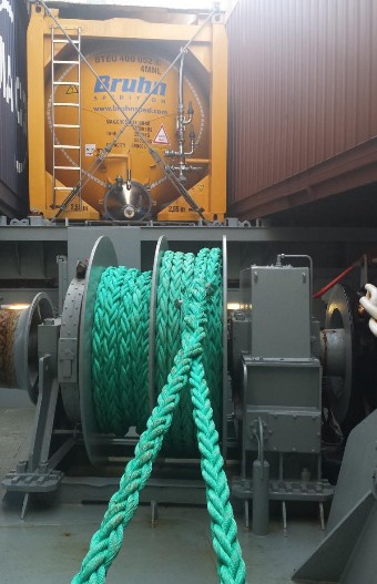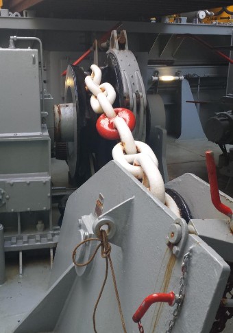 Besonders beeindrucken mich im Vorschiff (Bug) die Leinen, an denen das Schiff am Kai festgemacht wird, ca. 10 cm dick. Trotzdem kann es vorkommen, dass eine von denen reißt. Da kann man sich vorstellen, warum Passagiere sich bei diesen Manövern nicht in der Nähe aufhalten dürfen, viel zu gefährlich. – Die roten Glieder der Ankerkette kennzeichnen jeweils den Abstand von 1 Schäkel (= 25m), daran kann man abzählen, wie viel Ankerkette schon ausgelassen wurde.