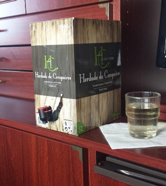 Vor der Rückfahrt mit dem Taxi habe ich noch die geniale Idee, mir in der Weinhandlung, die zur Markthalle gehört, Weißwein im Karton zu kaufen. Jetzt hat die Polterei der Flaschen im Kühlschrank ein Ende!