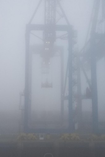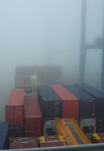 An Land fahren die großen Transportfahrzeuge scheinbar unbeirrt durch den Nebel. Da weiß man, warum Fußgänger hier nicht rumlaufen dürfen. Man kann kaum die Burschen am Kai erkennen, die die Leinen losmachen. Cpt sagt, Ablegen geht, aber Anlegen wäre Hölle bei solcher Sicht. Glaubt man aufs Wort.