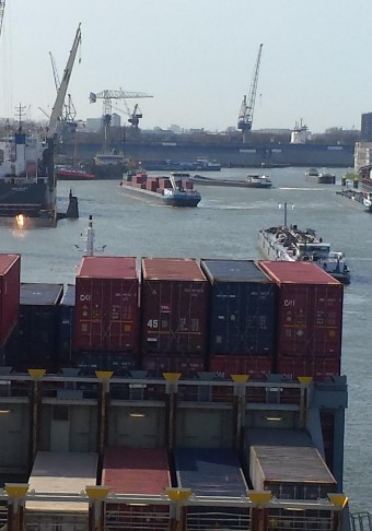 Abfahrt ab Rotterdam dann doch erst kurz vor 17:00. Jetzt muss Cpt Drewes noch mal seine Nerven beweisen. So ein Chaos bei der Ausfahrt aus dem engen Hafenbecken! Mehrere Bratschen (die flachen Flussschiffe) fahren gleichzeitig los, eine muss gar noch drehen, dann fahren zwei weitere Containerschiffe ein, ein dickes Tankschiff lungert an der Einfahrt herum, und gerade als wir dieses passieren, kommt noch ein winziges Sandschiff quer, das uns garantiert nicht gesehen hat ... Alles gut gegangen.
