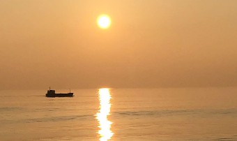 Das scheinbar glatte, in der frühen Sonne glänzende Meer, die riesigen Schiffe, die vor und neben uns ruhig ihren Kurs ziehen, das ist eine einzigartige, wundervolle Stimmung.