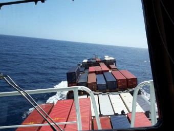 Verbrauch: 1500 l Diesel pro Stunde, das sind bei einer Durchschnittsgeschwindigkeit von 30 km/h etwa 5000l auf 100 km. Die wissbegierigen Passagiere haben gleich mal umgerechnet: wenn, wie jetzt, ca 700 Container an Bord sind, macht das pro Container ca 7,1l /100 km, bei Vollbeladung mit über 900 Containern nur noch ca 5,5l/100 km. Nicht schlecht, immerhin wiegt ein Container bis zu 35t!
