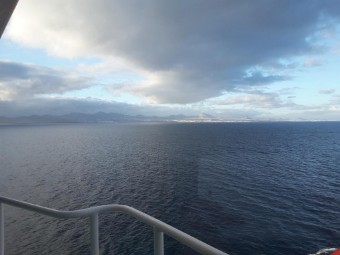 Gut, eine ganze Nacht lang geschlafen zu haben! So geht es auch dem Mitpassagier, den ich beim Frühstück treffe. Wir sind uns entspannt einig, dass das jetzt ist wie Busfahren, obwohl die normale Dünung das Schiff natürlich weiterhin unaufhörlich bewegt.
