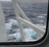 Zu der Auf- und Abbewegung des Schiffes ist nun ein heftiges seitliches Schaukeln (Rollen) gekommen. Auf der Brücke ist das am wenigsten unangenehm, weil man die Bewegungen sieht und die (Rück-)Be-wegungen vorhersehen kann. Aber auch hier muss man sich bei jedem Schritt gut festhalten.