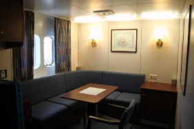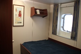 Ich richte mich in der gebuchten Eignerkammer ein. Abweichend von den Reiseunterlagen liegt diese auf der Backbordseite und hat vom Wohnraum keine Aussicht nach vorn, sondern lediglich zur Seite.