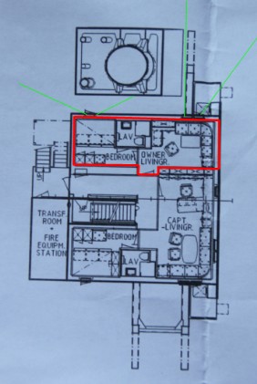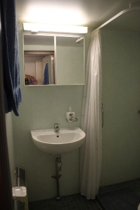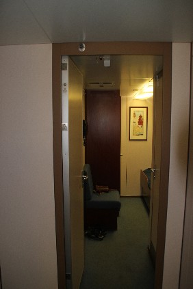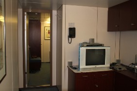 Vom Schlafraum blicke ich direkt gegen den einen Meter entfernten, gewaltigen Schornstein, wie er bei Sietas-Schiffen üblich ist. Na ja, wenn ich schlafe, habe ich üblicherweise ohnehin die Augen geschlossen.Also nicht davon stören lassen und erst einmal mein neues Quartier für die kommenden Tage inspizieren: Kühlschrank, Fernseher, Videorecorder und Radio sind vorhanden, was will man mehr. Aber: braucht man das auch? Leider fehlt ein Schreibtisch. Das Bett im separaten Schlafraum hat mit 1,2 m Breite für mich als Alleinreisenden „königliche“ Ausmaße. Zum Mittagessen in der Offiziersmesse gibt es eine Vorsuppe, Cordon Blue und Obst.