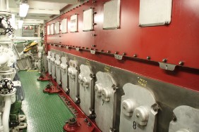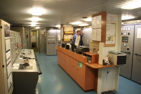 Mit dem Chief gehe ich um 13:30 Uhr in den Maschinenkontrollraum und starte die Hauptmaschine, ein einfacher Knopfdruck genügt! Kurz darauf laufen wir aus. Anschließend kann ich mir die Maschinenanlage gründlich ansehen, ohne eine sonst übliche Begleitung. Chief, 2. Ingenieur und Öler haben alles TipTop in Schuss.