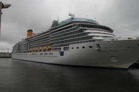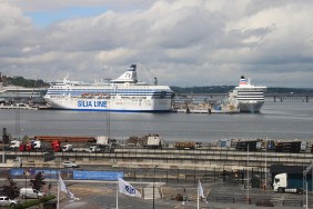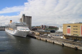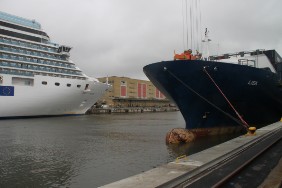 Die Buslinie 76 verkehrt alle 20 Minuten, benötigt für die Fahrt ganze 15 Minuten, also ideal. Leider sollen wir schon um ca. 12-13 Uhr auslaufen. Eine genauere Zeitangabe ist nicht möglich, da der Lotse bisher die Zeit nicht bestätigt hat. Mir erscheint die zur Verfügung stehende Zeit zu gering und ich beschließe, mich im Hafen umzusehen. Da schon kurz nach dem Frühstück ein weiterer Gast in unser Hafenbecken einläuft, vergeht die Zeit recht schnell. Bei dem Gast handelt es sich um die COSTA LUMINOSA. Der Kreuzfahrer dreht vor dem Hafenbecken und schiebt sich langsam rückwärts an seinen Liegeplatz am gegenüber liegenden Kai.