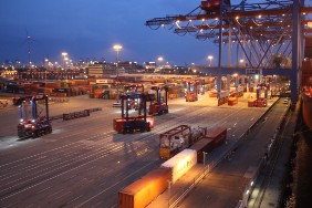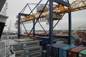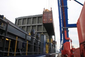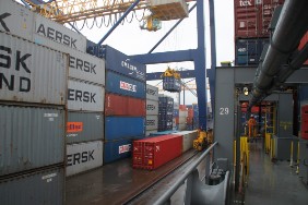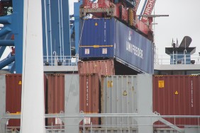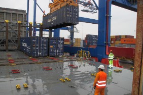 Auch am Ende der Reise wartet ein nicht alltägliches Schauspiel auf mich: Bei der Entladung der FREYA hat man einen Twistlock vergessen. Die Verladebrücke hat daher den 2. Container mit angehoben, der hing nun an nur einem Twistlock. Es ist aber letztendlich alles gut gegangen.
