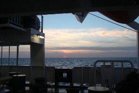 Zum Frühstück gibt es zur Abwechslung Pfannkuchen, auf Wunsch natürlich auch Eier wie jeden Tag. Wir fahren weiterhin mit nur 11 kn bei inzwischen herrlichem Sonnenschein und leichter Bewölkung bei ca. 18 kn Wind, das entspricht Beaufort 5. Zum Mittag (es ist Sonntag!) gibt es Scampis mit Schale, auch der Kapitän ist darüber nicht unbedingt begeistert. Der Wind frischt etwas auf (ca. 25 kn / 6 Beaufort). Wir fahren gegenan mit 10,6 kn bei immer noch schönstem Sonnenschein. Trotz der nur 17° C ist es auf der Back im Windschatten gut auszuhalten, der Weg dorthin allerdings recht erfrischend. Ab Ölands Södra Grund ist der Schiffsverkehr etwas reger. Es wird ein schöner Abend mit herrlichem Sonnenuntergang.