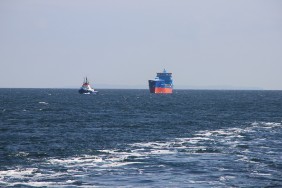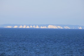 Bei herrlichem Sonnenschein passieren wir um 06:30 Uhr Kap Arkona auf Rügen, eine halber Stunde später leuchten auf Steuerbordseite die Kreidefelsen von Mön. In der Kadetrinne herrscht dichter Verkehr. Wir überholen einen Schleppverband (MIRVA VG + Schlepper ATLANT).