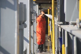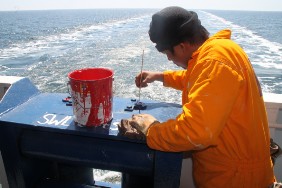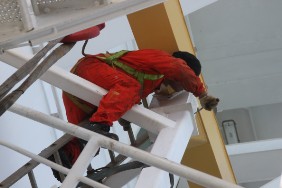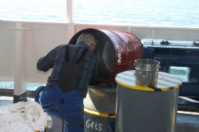 Den Tag verbringe ich mit einem ausgiebigen Rundgang übers Schiff. Der Besatzung bei ihren Wartungsarbeiten zuzusehen, ist doch recht interessant, insbesondere wenn dabei ein paar zirkusreife Darbietungen zu sehen sind. Einer der Matrosen kennzeichnet mit viel Geduld die Schmiernippel an allen beweglichen Punkten an Deck mit roter Farbe.