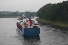 Um 07:00 Uhr sind wir schon im Nord-Ostsee-Kanal Höhe Hochdonn. Die Fahrt auf der Elbe und die Schleusung in Brunsbüttel habe ich doch glatt verschlafen. Das Wetter ist bedeckt, auf dem Kanal herrscht wenig Verkehr.
