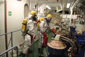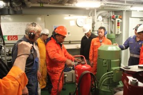 Da auf dieser Reise mehrere Besatzungsmitglieder neu hinzugekommen sind, hat der Kapitän eine groß angelegte Sicherheitsübung angesetzt. Um 16:00 Uhr geht es los, alle Mann antreten auf der „Muster Station“. Thema der Übung ist „Feuer im Maschinenraum“ mit anschließendem Besetzen des Rettungsbootes. Nach gut einer Stunde geht es im normalen Seebetrieb weiter. Zwischenzeitlich haben wir die Geschwindigkeit auf nur 12,2 kn verringert.