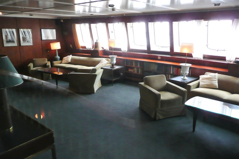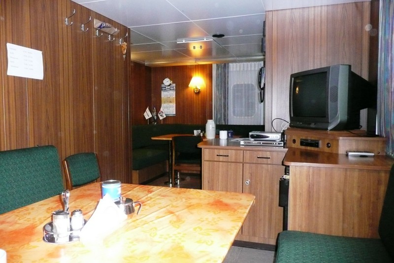 Auf den ersten beiden Bildern ist gut zu erkennen, dass die Offiziersmesse eigentlich aus zwei Räumen besteht. Passagiere und Offiziere haben jeweils einen Raum für sich. Die Passagiermesse wird weiterhin als Aufenthaltsraum benutzt, in dem man zusammen fernsieht.