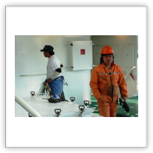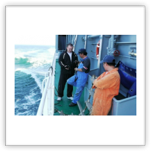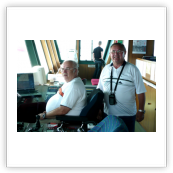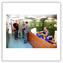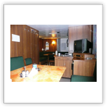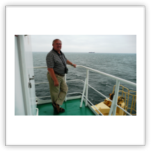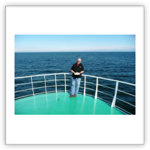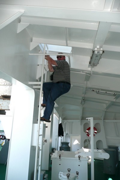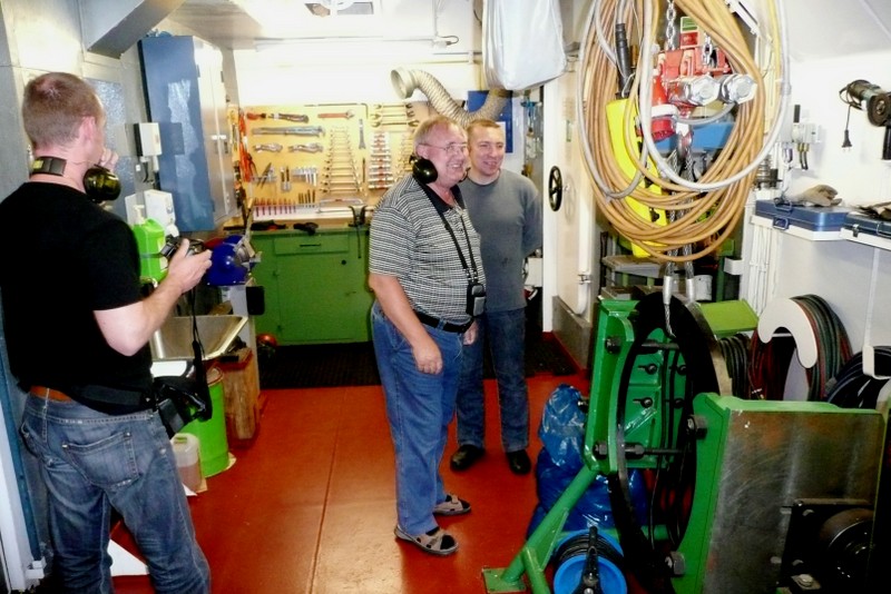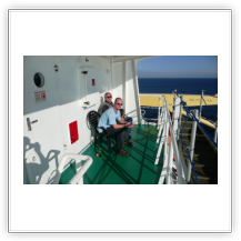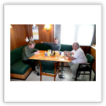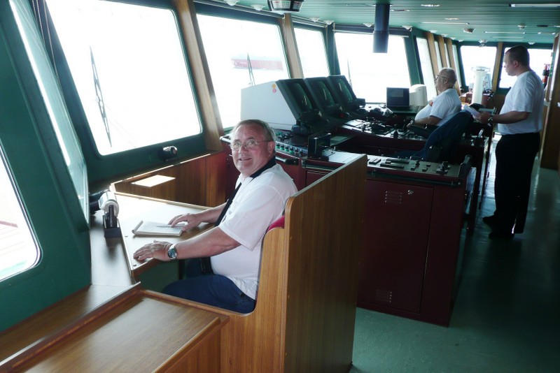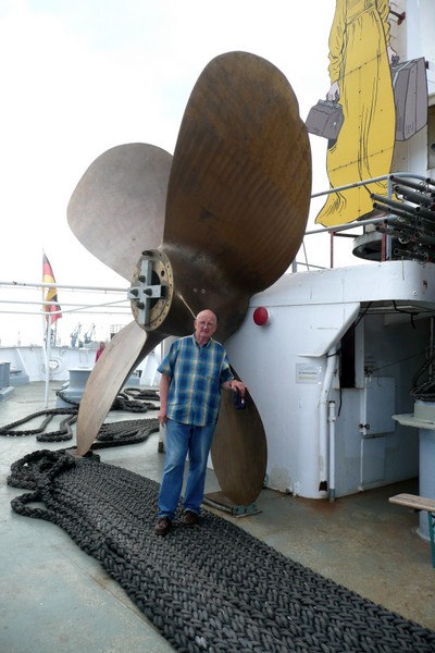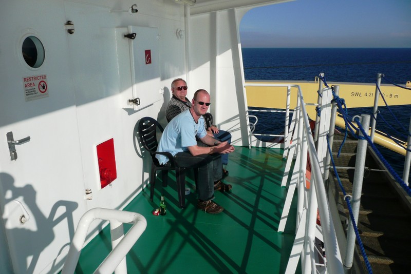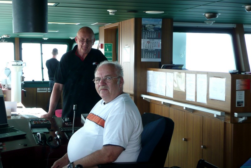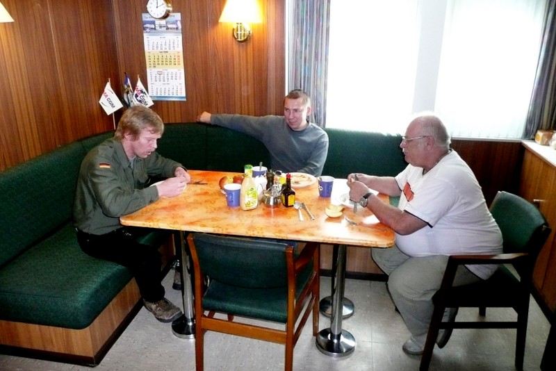 Nachdem wir den steilen Aufgang zum Schiff bewältigt hatten, trafen wir auf einen Decksmann, der uns zu unseren Kammern brachte. Es war kurz vor 10.00 Uhr und wir machten uns auf den Weg zur Messe weil die "Coffee Time" anstand. Unterwegs trafen wir auf unseren Mit-Passagier Jens Greuel aus Hamburg. Ein netter Kerl mit dem wir uns sofort gut verstanden. In der Messe lernten wir dann Kapitän Wulff und weitere Offiziere kennen.