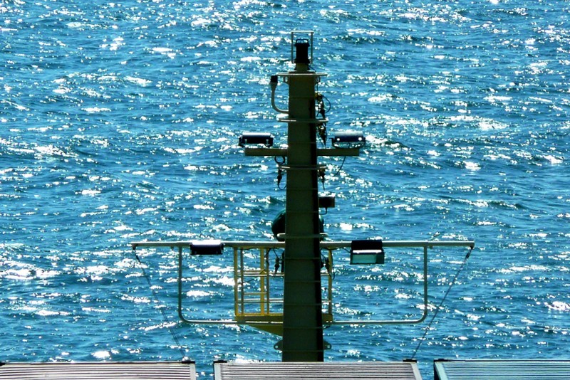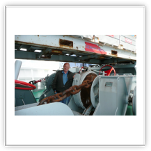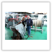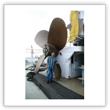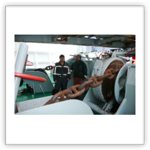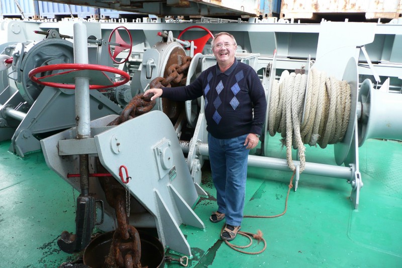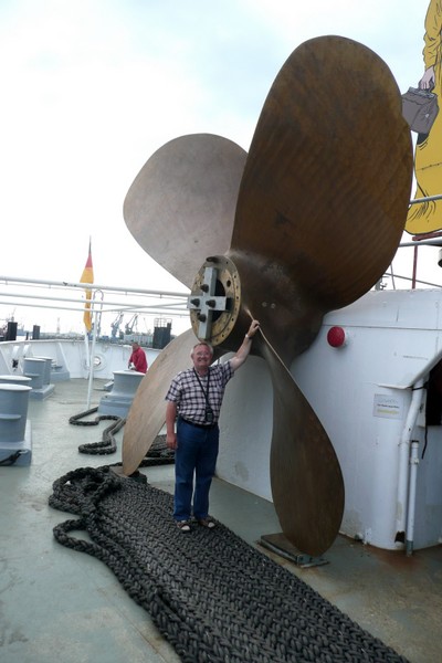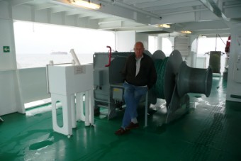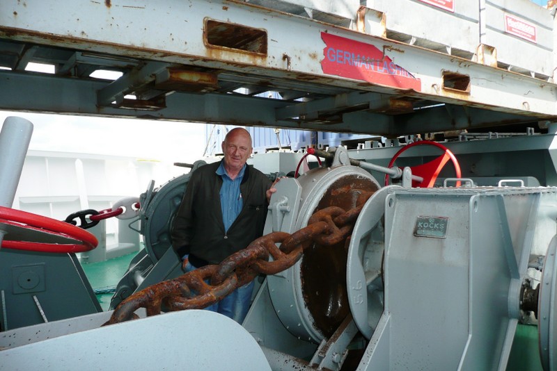 Auf dem nebenstehenden Bild sieht man Uli an einer der Festmacherwinschen. Mit diesen Winschen werden die Festmacherleinen beim Auslaufen nach dem Loswerfen von Land wieder eingeholt. Beim Festmachen des Schiffes an der Pier dienen sie dazu, eine feste Verbindung der Leine (der Seemann sagt: Die Leine wird "tight geholt") vom Schiff zum Poller an der Pier herzustellen. Bei den An- und Ablegemanövern empfiehlt es sich DRINGEND, sich von diesen straffen Verbindungen fern zu halten. So eine Leine kann auch sehr schnell mal reißen (der Seemann sagt: "brechen"). Eine brechende Leine ist in der Lage schwerste Verletzungen zu verursachen. Also am besten immer in eine abgelegene sichere Ecke verkrümeln, oder noch besser, ein Deck höher gehen. Von dort aus kann man dann alles aus sicherer Entfernung ganz entspannt beobachten oder fotografieren.