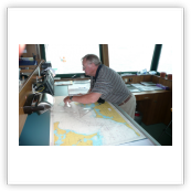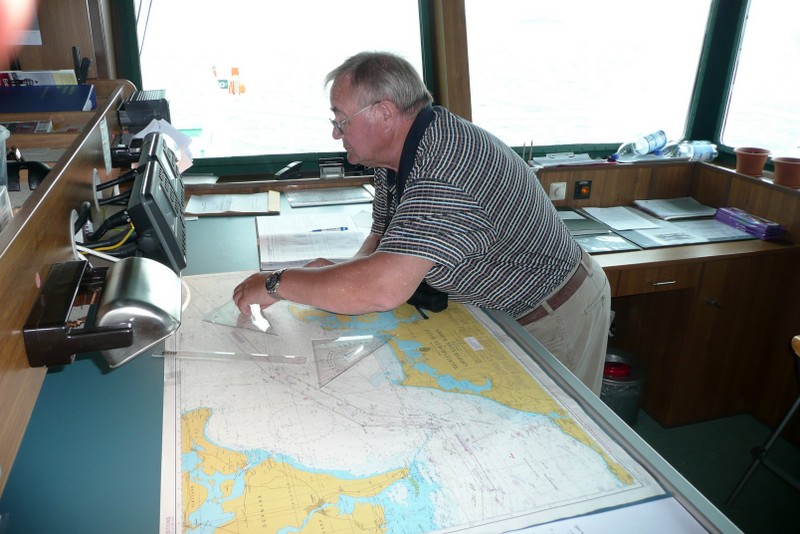 Für die Navigation werden natürlich GPS und elektronische Seekarten verwendet. Parallel hierzu wird aber immer noch die alte Seekarte benutzt, wo der Kurs mit Zirkel und Lineal abgesteckt wird wie weiter unten zu sehen.