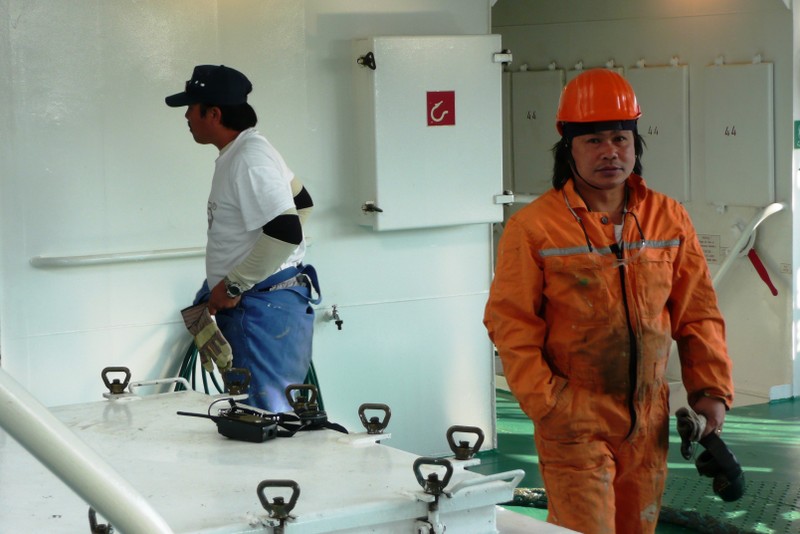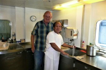 Die Köche, auf allen Schiffen "Cookie" genannt, haben meiner Meinung nach den härtesten Job an Bord, 3 Mahlzeiten pro Tag, meistens warme Gerichte sind zu bereiten. Deutsche Kost für Offiziere und Passagiere sowie Gerichte "Asian-Style" für die vorwiegend philippinische Besatzung.