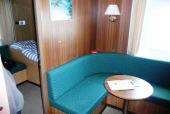 Die Kammern für die Passagiere liegen auf dem D-Deck und verfügen über einen Wohnraum mit Sitzecke und einen separaten Schlafraum. Selbstverständlich gibt es auch ein Bad mit Dusche, Waschbecken und WC. Hier kann man sich wirklich sehr wohl fühlen. Die folgenden Bilder werden das sicher bestätigen.
